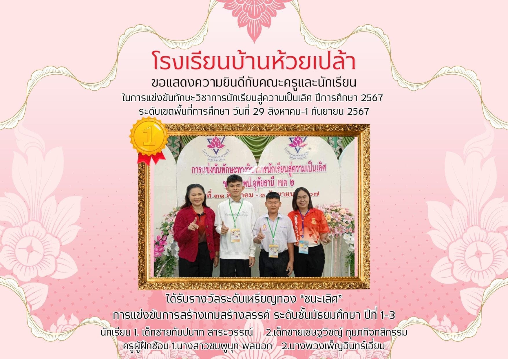 ชนะเลิศ เหรียญทอง การแข่งขันการสร้างการ์ตูนแอนิเมชั่น (2D Animation) ระดับ ม.1-ม.3