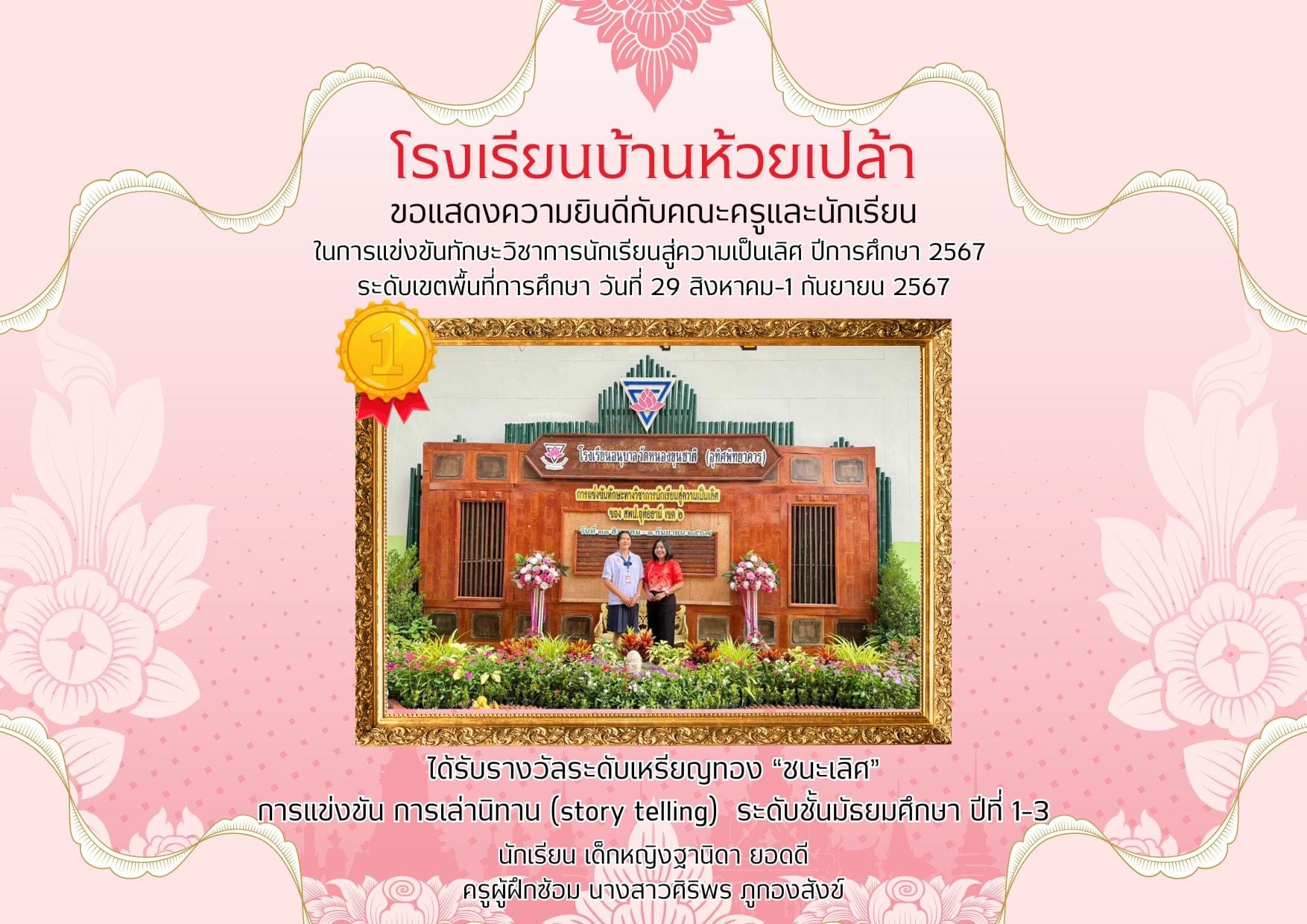 ชนะเลิศ เหรียญทอง การแข่งขันการเล่านิทาน ประเภทนักเรียนที่มีความบกพร่องทางร่างกายฯ ระดับ ม.1-ม.3